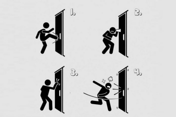 Situata e propozuar është si më poshtë: një person që njihni ju fton të shkoni në një vend të caktuar. Me të mbërritur, ju e shihni derën të mbyllur, cili është reagimi juaj? Në të gjitha rastet ekzistojnë katër lloje të mundësive, përkatësisht: të hapësh derën me forcë dhe të hysh, të përgjosh për të kuptuar se çfarë po ndodh pas derës, të trokasësh dhe së fundi të bërtasësh.
